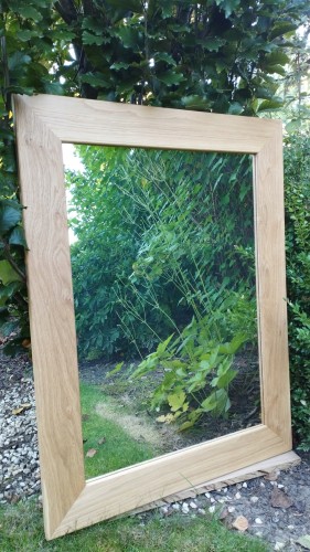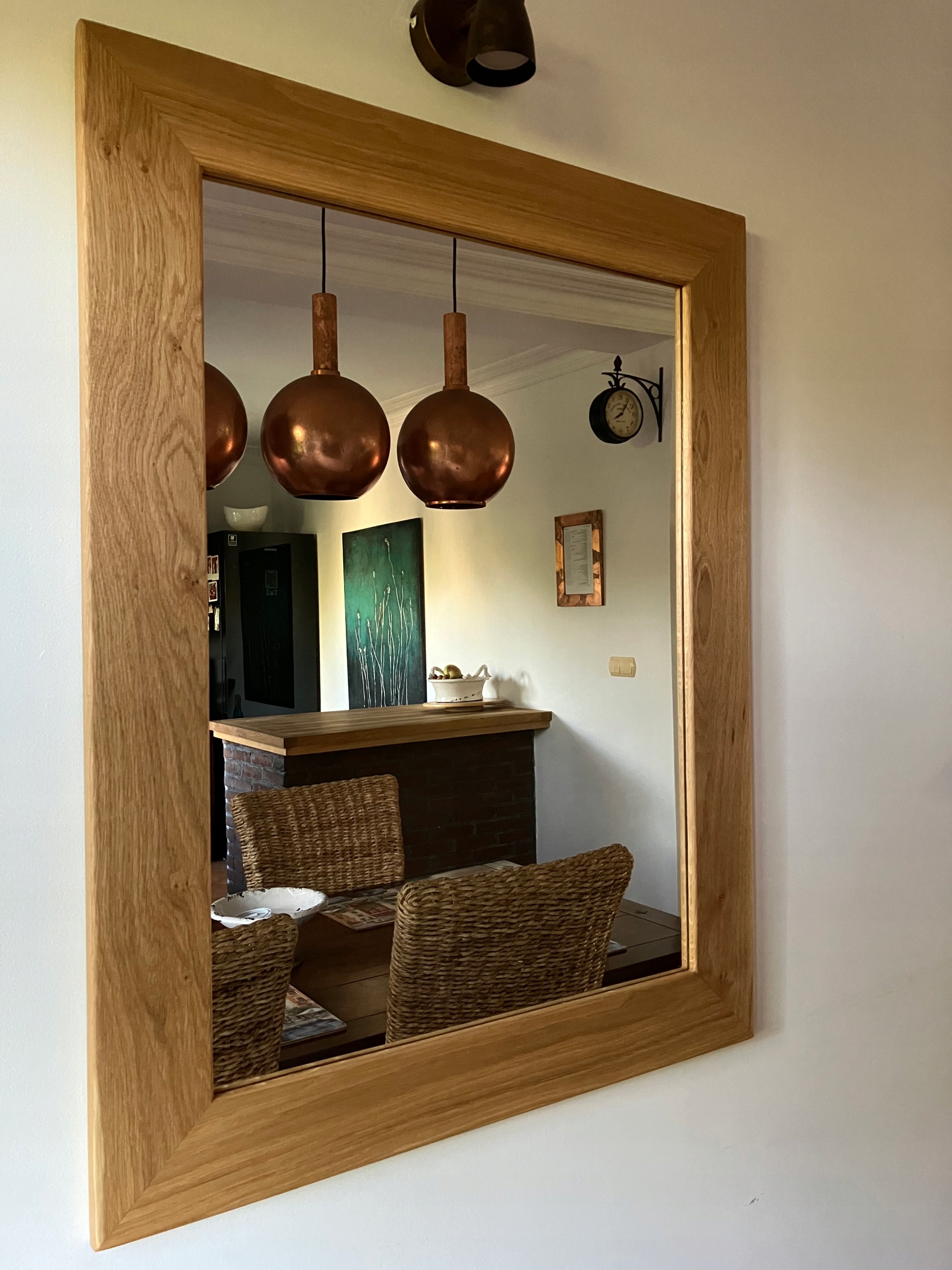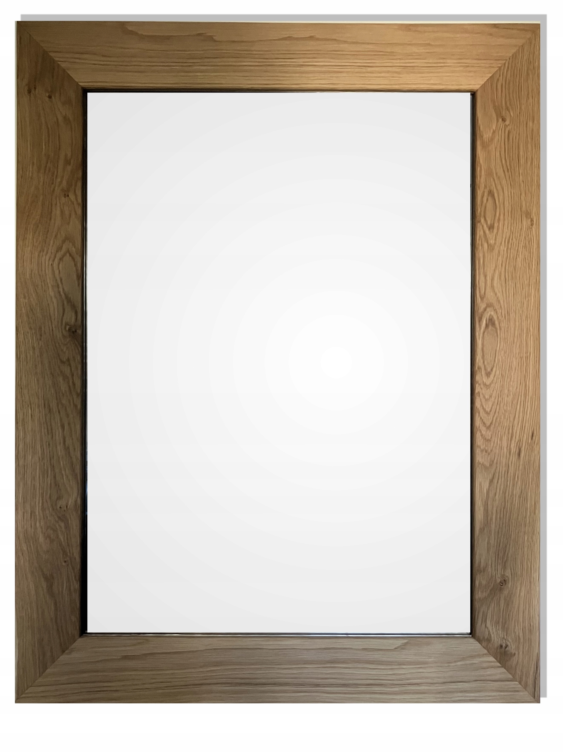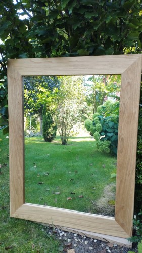 Wykonanie: Rama lustra wykonana jest z litego dębu, posiada płaski profil. Kanty są lekko zaokrąglone. Charakteryzuje ją niezwykle piękny rysunek naturalnych słojów, to dzięki dwukrotnemu zabezpieczeniu bezbarwnym olejem. Lustro można powiesić w wilgotnych pomieszczeniach - łazienkach. Lustro w takiej ramie doskonale prezentuje się w nowoczesnych wnętrzach , na przykład z zastosowaniem betonu lub kamienia.