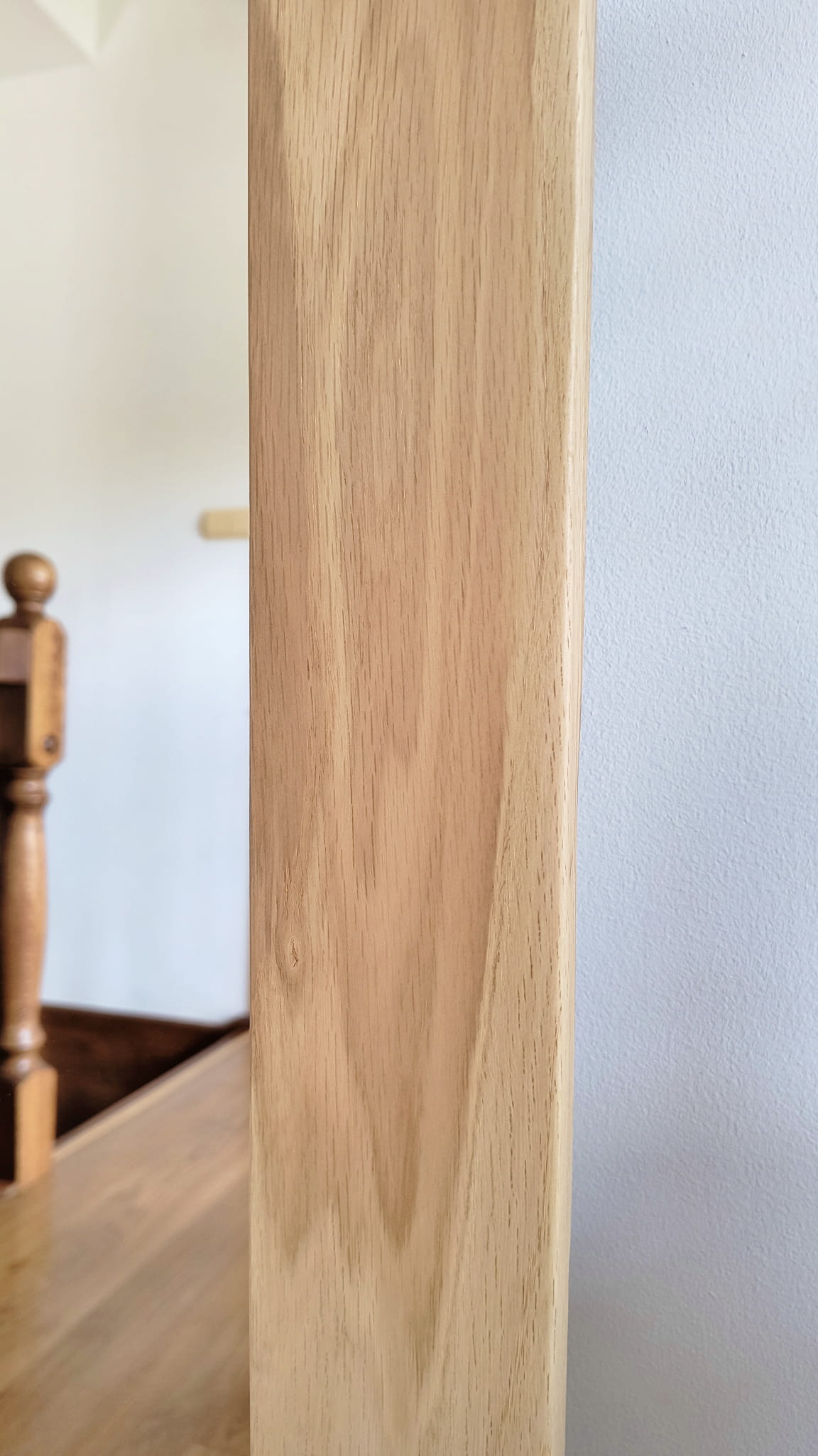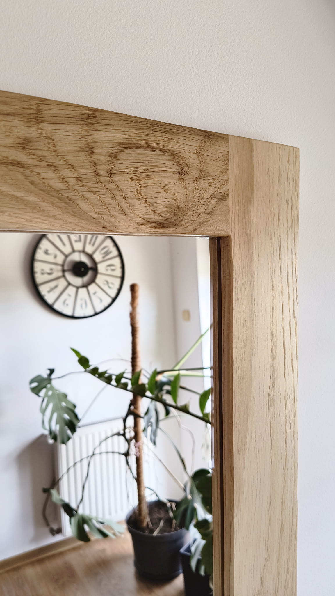 Wykonanie: Rama lustra wykonana jest z litego dębu, posiada płaski profil. Kanty są lekko zaokrąglone. Charakteryzuje ją niezwykle piękny rysunek naturalnych słojów, to dzięki dwukrotnemu zabezpieczeniu bezbarwnym olejem. Lustro można powiesić w wilgotnych pomieszczeniach - łazienkach. Lustro w takiej ramie doskonale prezentuje się w nowoczesnych wnętrzach , na przykład z zastosowaniem betonu lub kamienia.