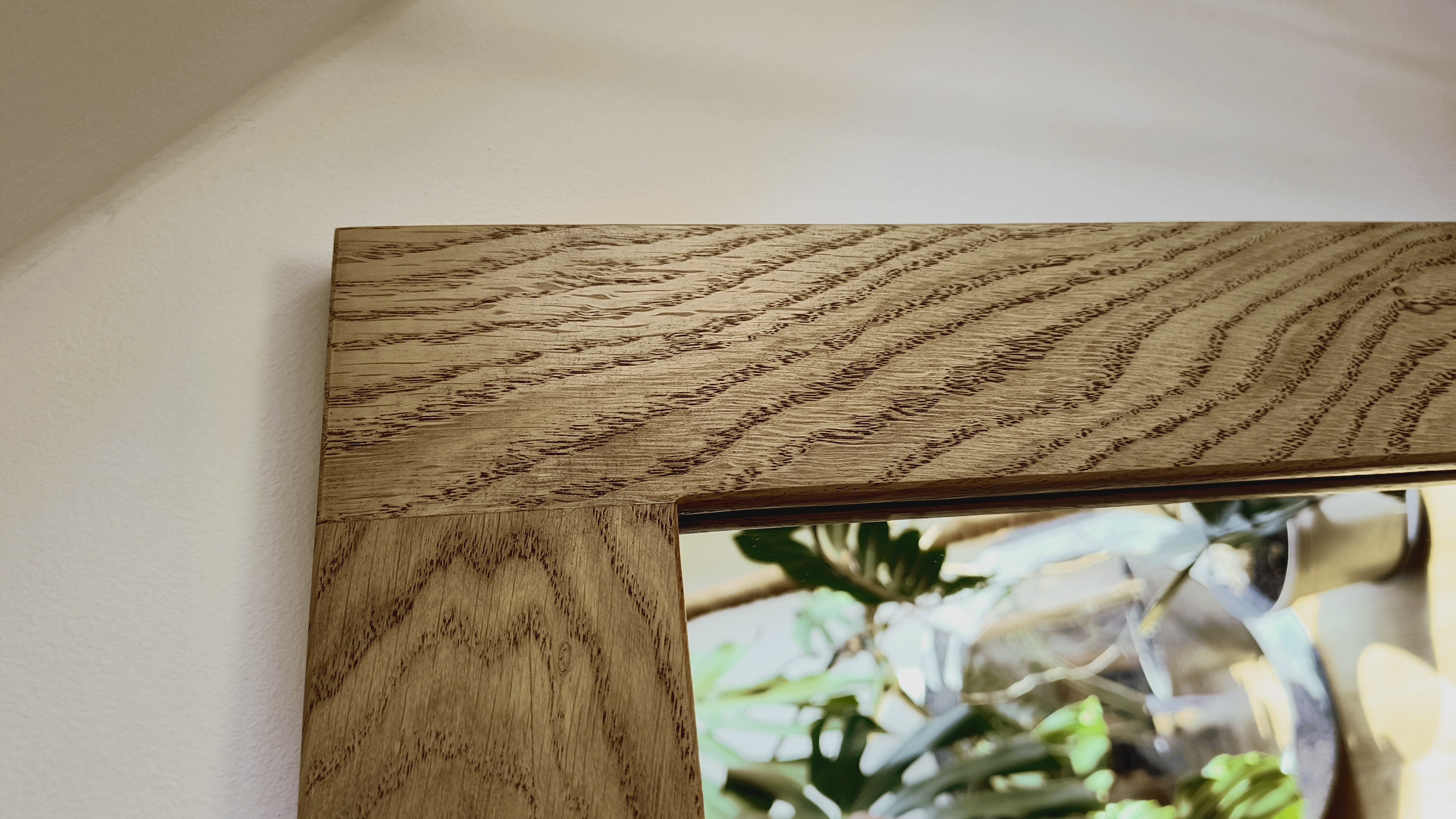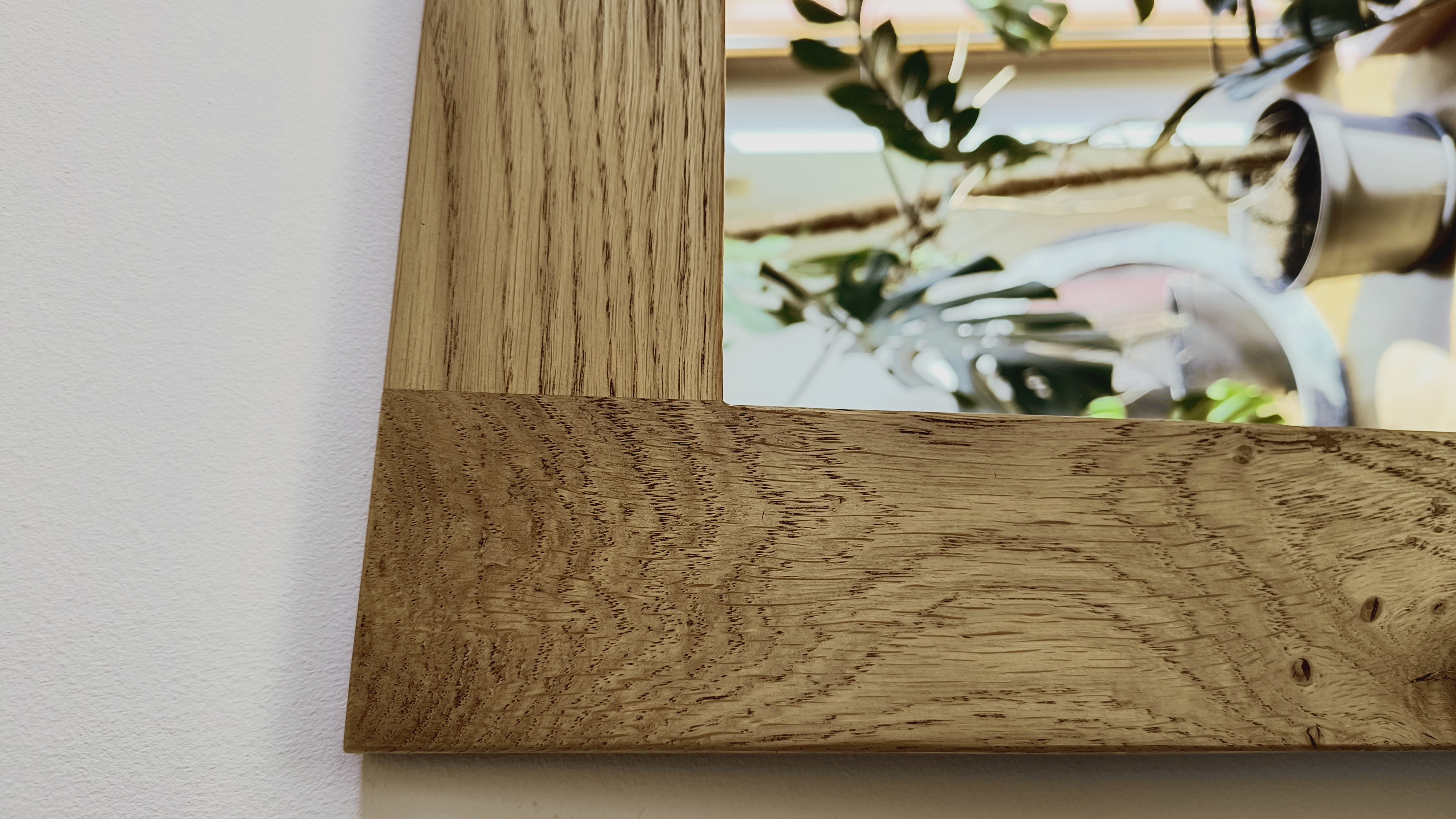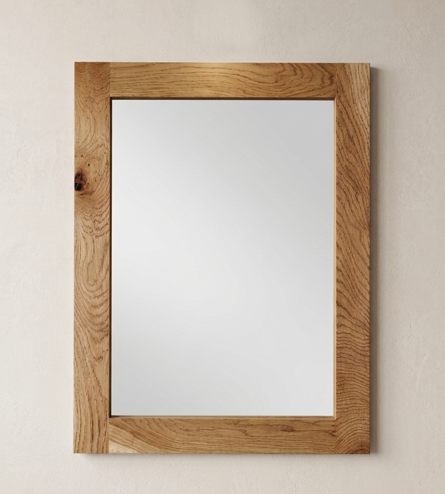 Wykonanie: Rama lustra wykonana jest z litego dębu, posiada płaski profil. Kanty są lekko zaokrąglone. Charakteryzuje ją niezwykle piękny rysunek naturalnych słojów, to dzięki dwukrotnemu zabezpieczeniu bezbarwnym olejem.