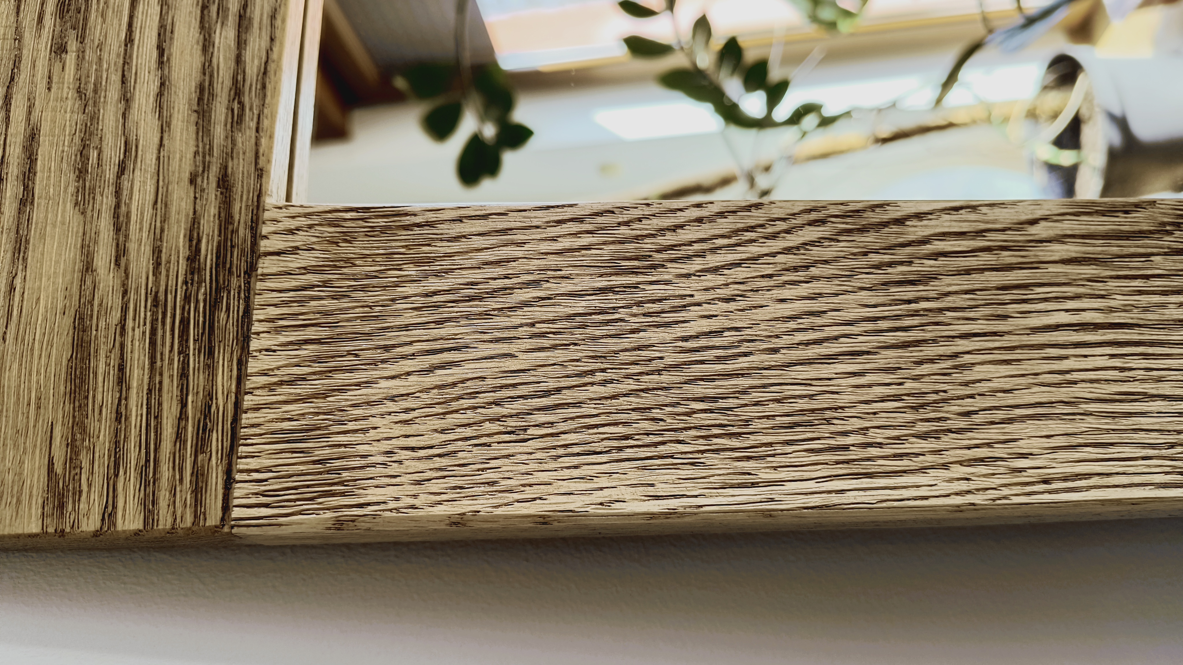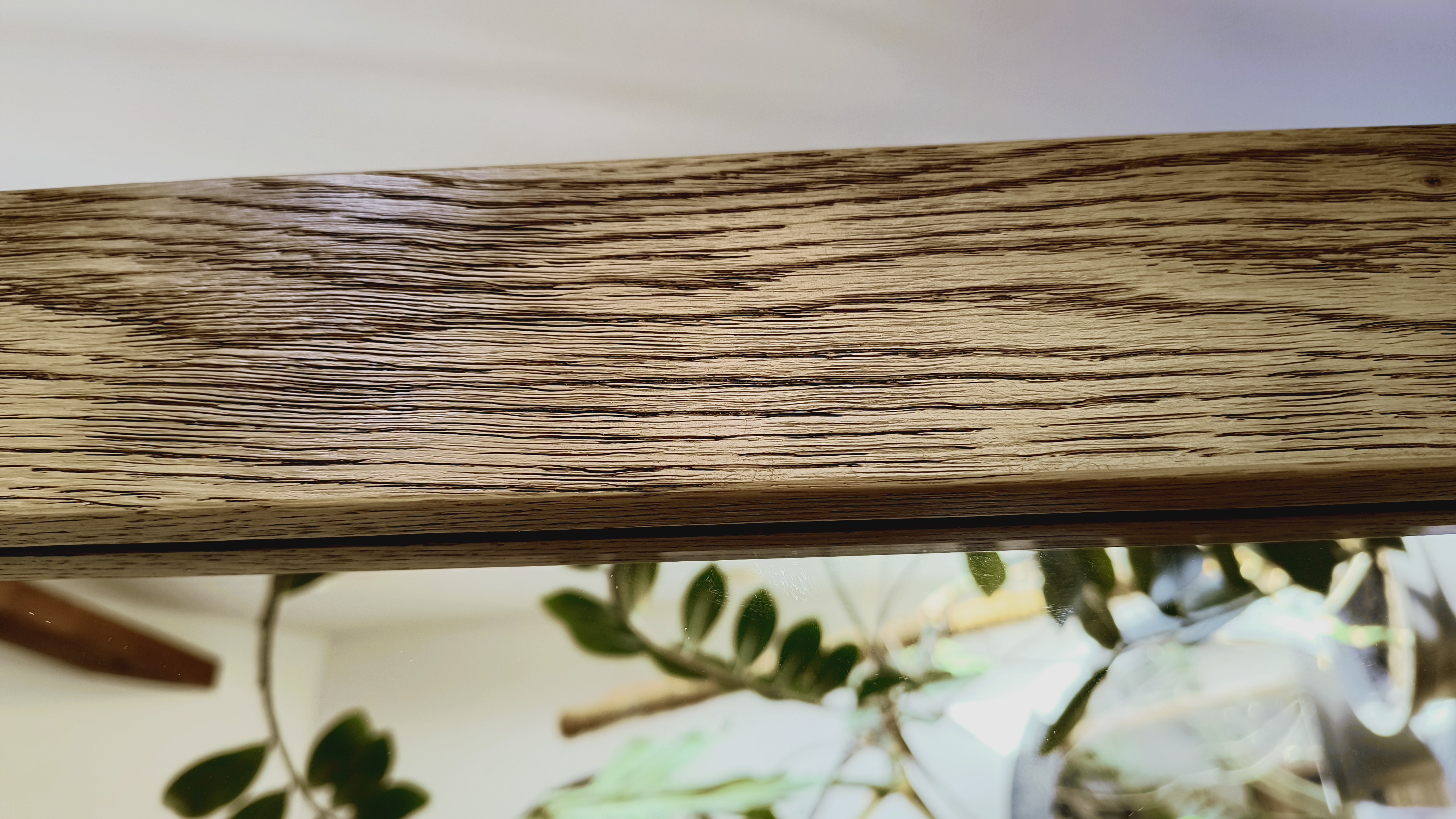 Wykonanie: Rama lustra wykonana jest z litego dębu szczotkowanego, z wyraźnie wyczuwalną pod dłonią ,strukturą drewna. Posiada płaski profil. Charakteryzuje ją niezwykle piękny rysunek naturalnych słojów, to dzięki dwukrotnemu zabezpieczeniu bezbarwnym olejem.