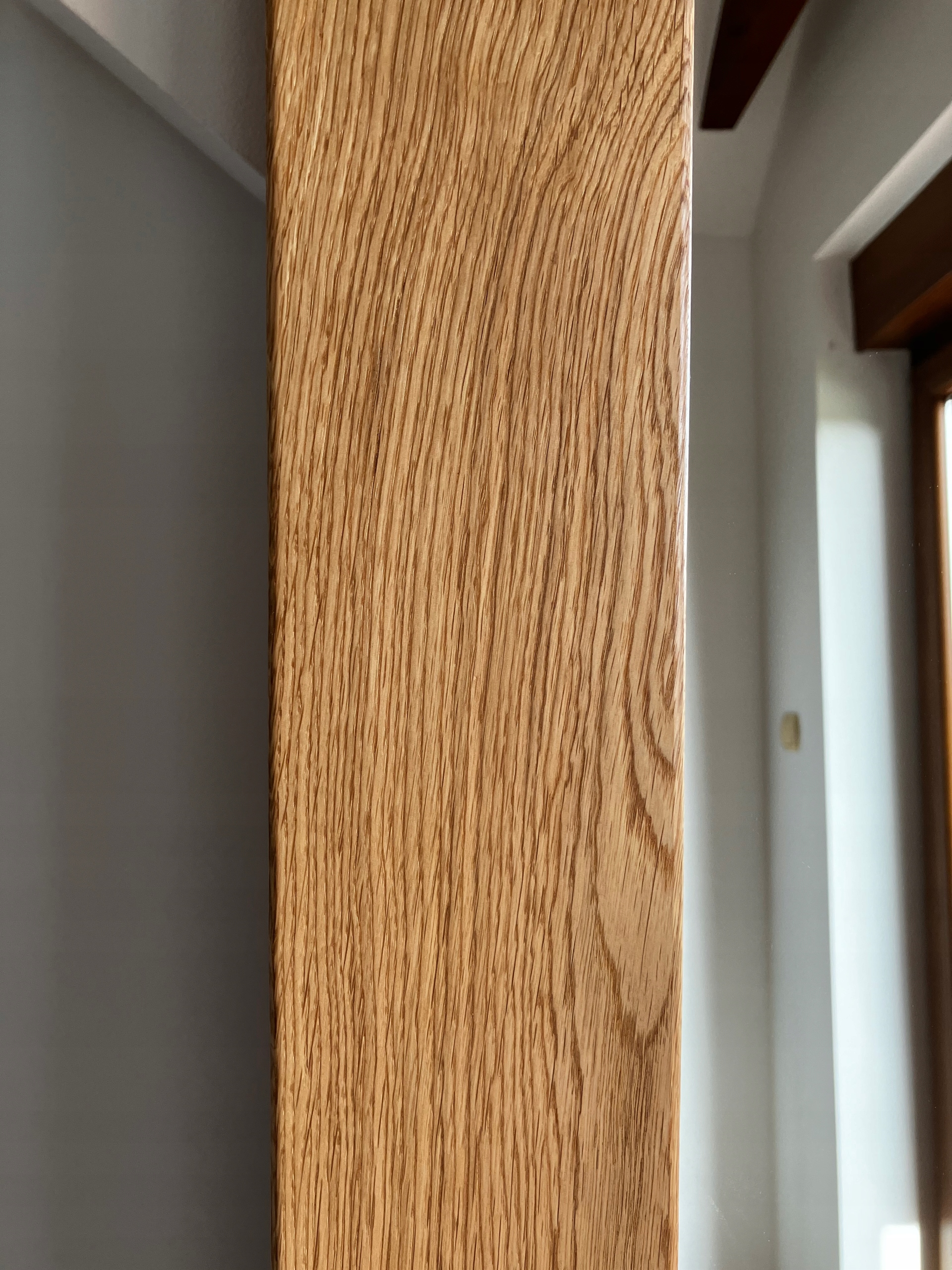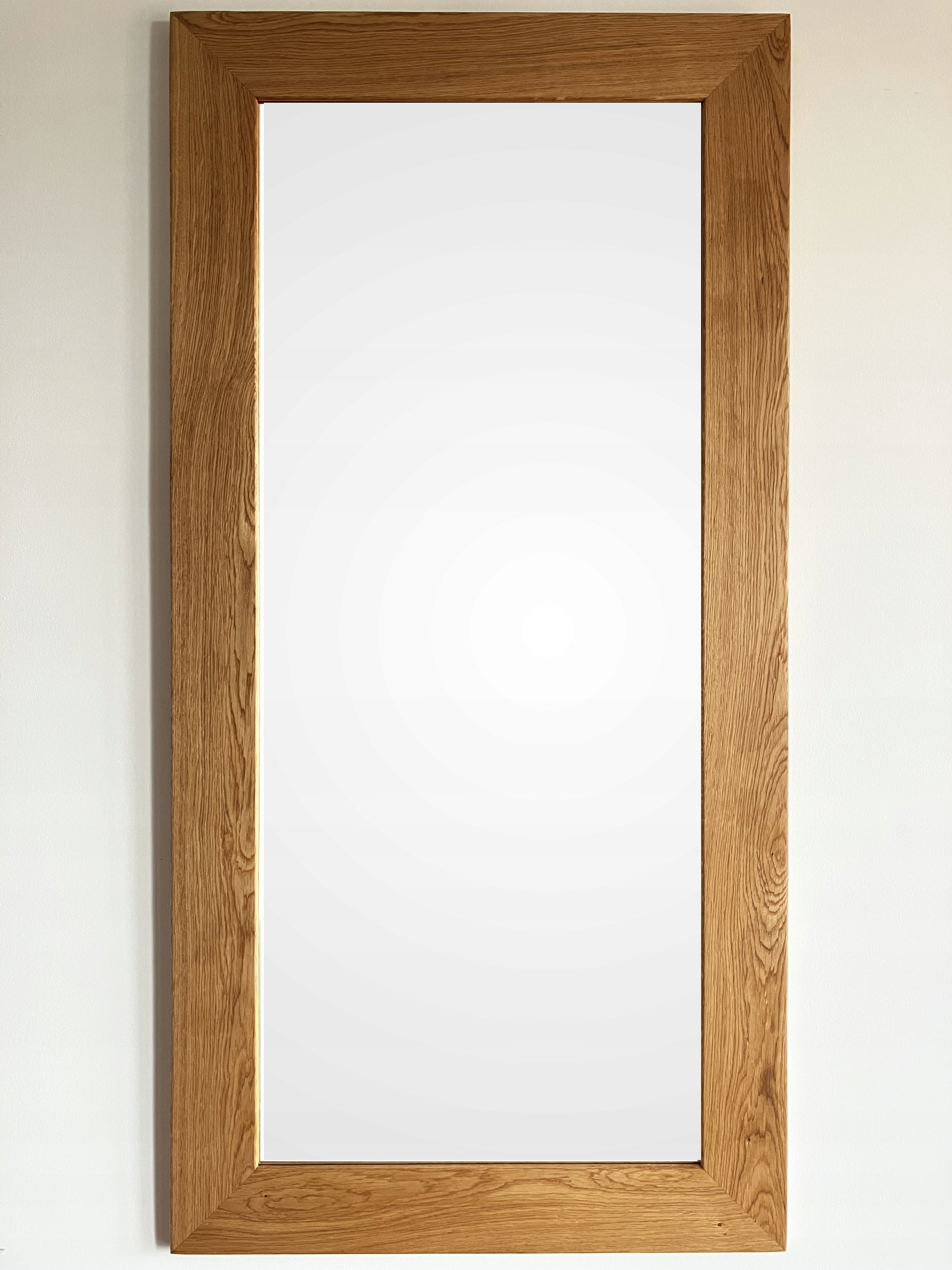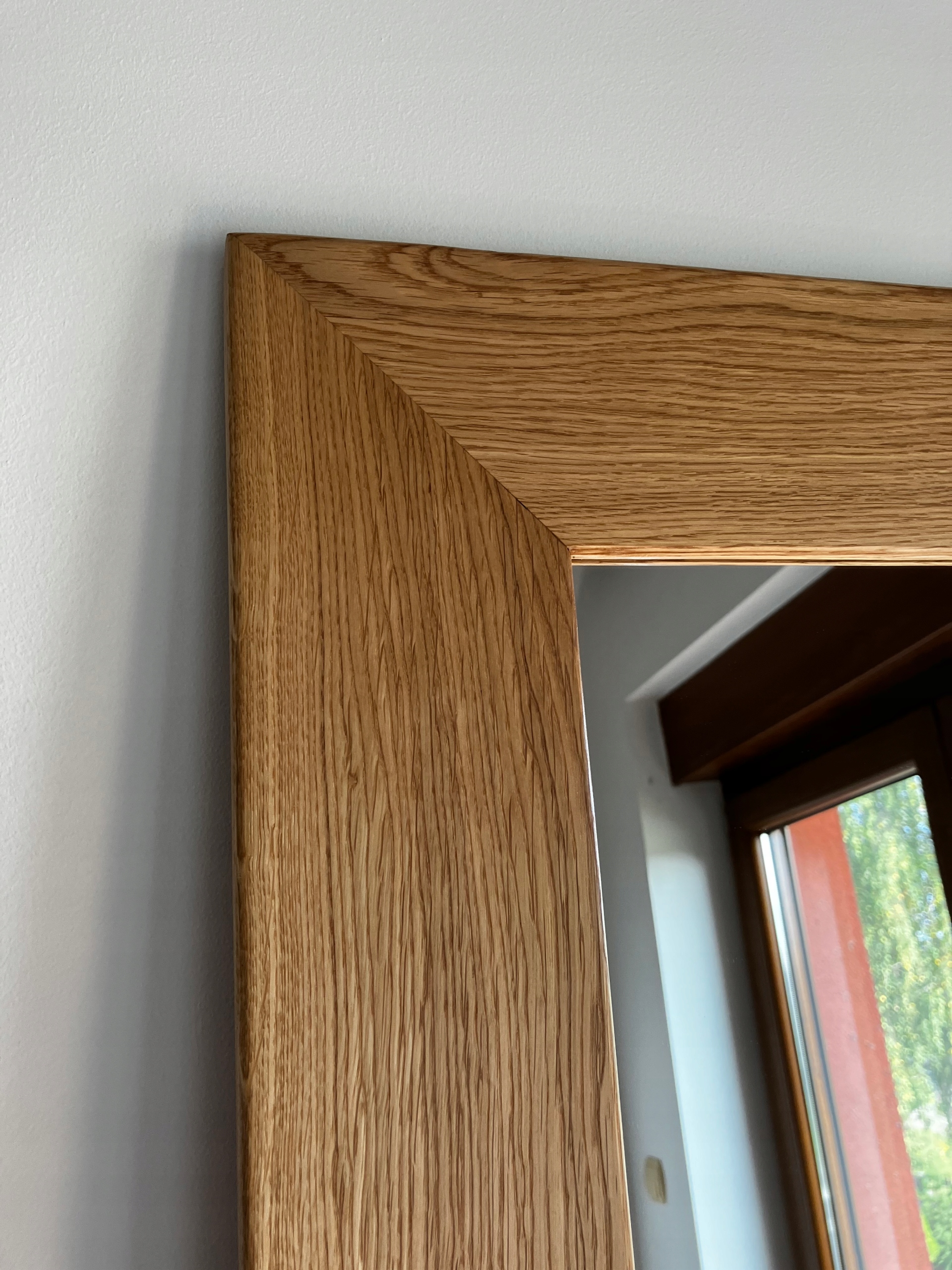 Wykonanie: Rama lustra wykonana jest z litego dębu, posiada płaski profil. Kanty są lekko zaokrąglone. Charakteryzuje ją niezwykle piękny rysunek naturalnych słojów, to dzięki dwukrotnemu zabezpieczeniu bezbarwnym olejem.