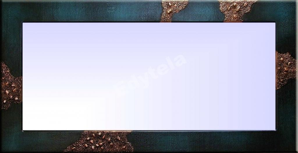 Wykonanie: Rama malowana jest ręcznie w odcieniach granatu oraz turkusu, posiada bardzo ciekawą fakturę. Ponadto jest wysadzana naturalnymi kamieniami o różnej grubości. Dekory zdobione są miedzią (do wyboru kolor złoty lub aluminium) oraz patynowane, dla podkreślenia wypukłości. Ramę zabezpieczyliśmy satynowym lakierem, dzięki czemu doskonale sprawdza się również w wilgotnych pomieszczeniach np. w łazienkach. Ramę możemy powiesić w pionie lub w poziomie( po zakupie prosimy o informację). Tak oprawione lustro doskonale prezentuje się w nowoczesnych wnętrzach.