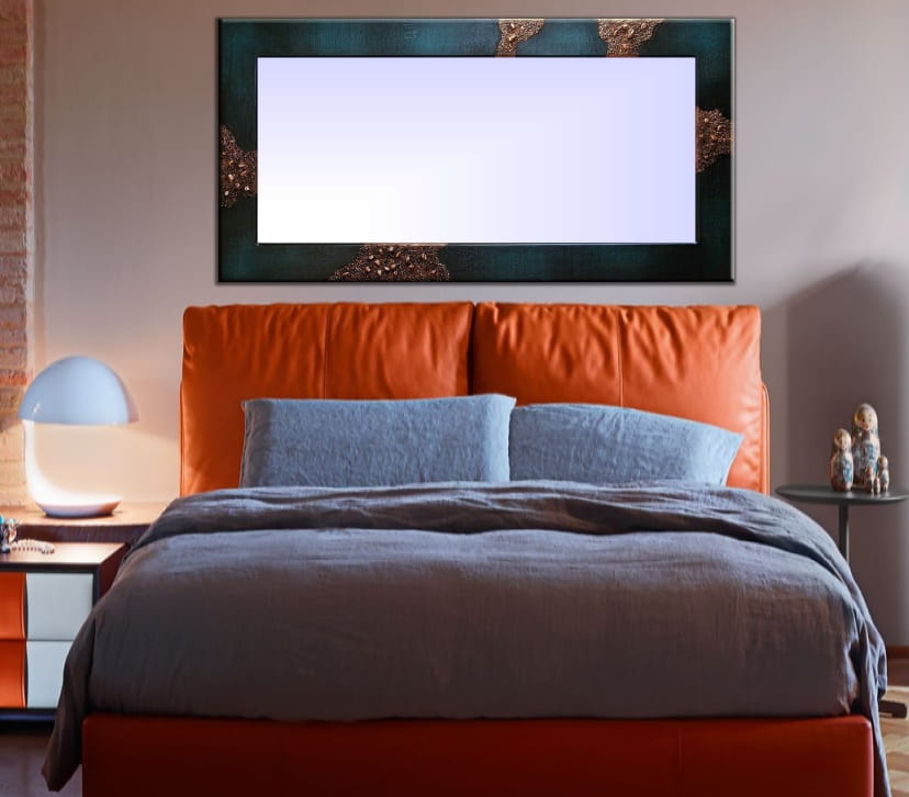 Wykonanie: Rama malowana jest ręcznie w odcieniach granatu oraz turkusu, posiada bardzo ciekawą fakturę. Ponadto jest wysadzana naturalnymi kamieniami o różnej grubości. Dekory zdobione są miedzią (do wyboru kolor złoty lub aluminium) oraz patynowane, dla podkreślenia wypukłości. Ramę zabezpieczyliśmy satynowym lakierem, dzięki czemu doskonale sprawdza się również w wilgotnych pomieszczeniach np. w łazienkach. Ramę możemy powiesić w pionie lub w poziomie( po zakupie prosimy o informację). Tak oprawione lustro doskonale prezentuje się w nowoczesnych wnętrzach.