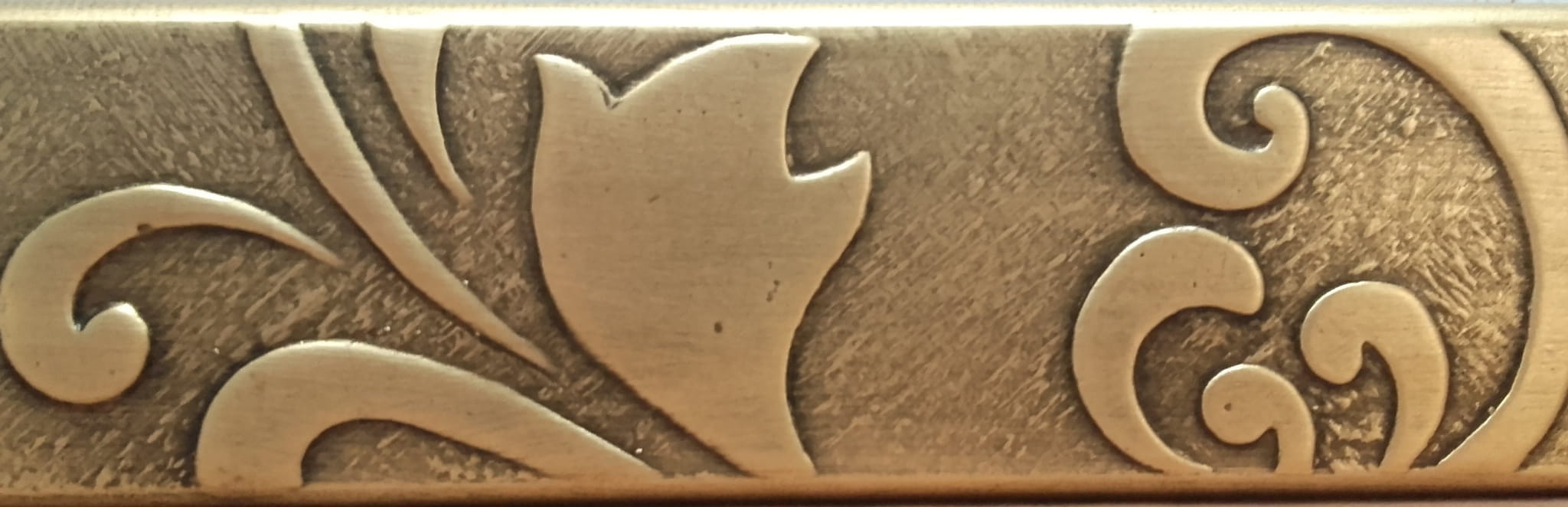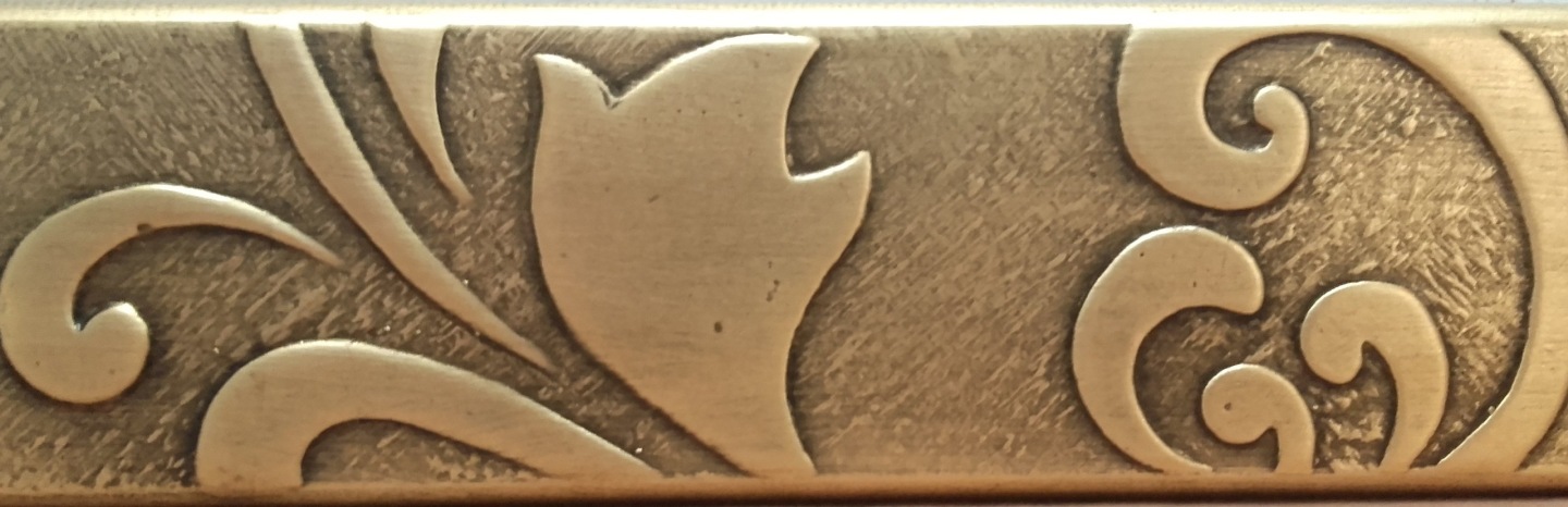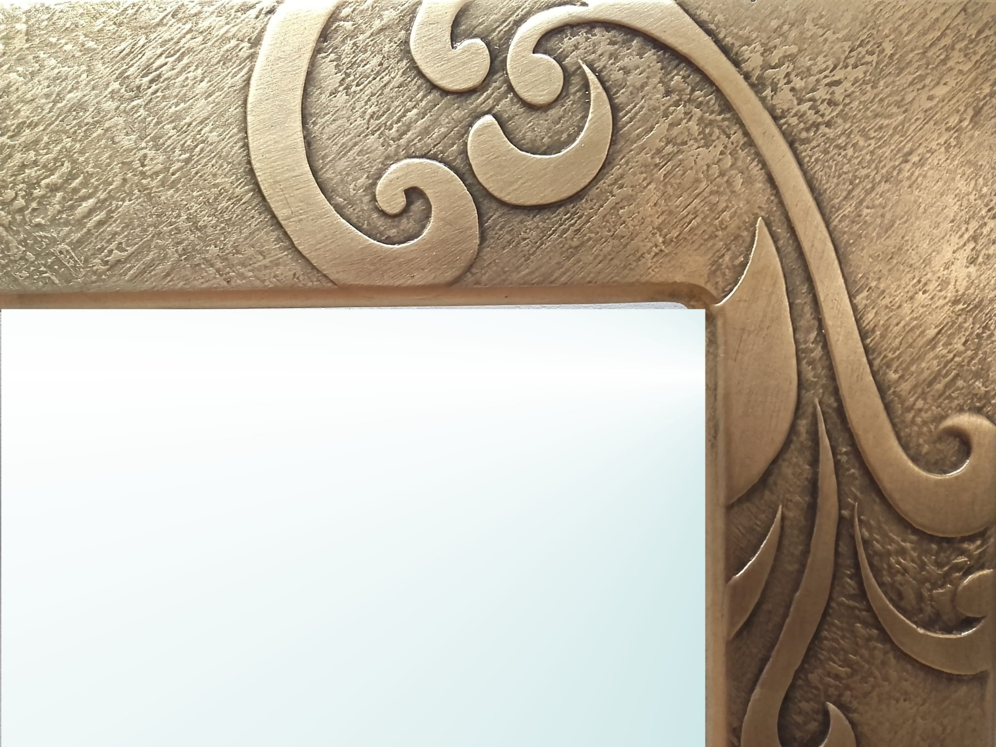 Rama wykonywana jest etapami. Posiada bardzo oryginalną fakturę. Nakładane są wypukłe aplikacje ,cała rama w końcowej fazie zdobiona jest metalem w płatkach oraz patynowana dla podkreślenia wypukłości (kolor POSTARZONE ZŁOTO). Zabezpieczona jest lakierem, dzięki czemu doskonale sprawdza się również w wilgotnych pomieszczeniach np. w łazienkach. Stosujemy lustra kryształowe, renomowanej firmy. Rama posiada płaski, nowoczesny profil.