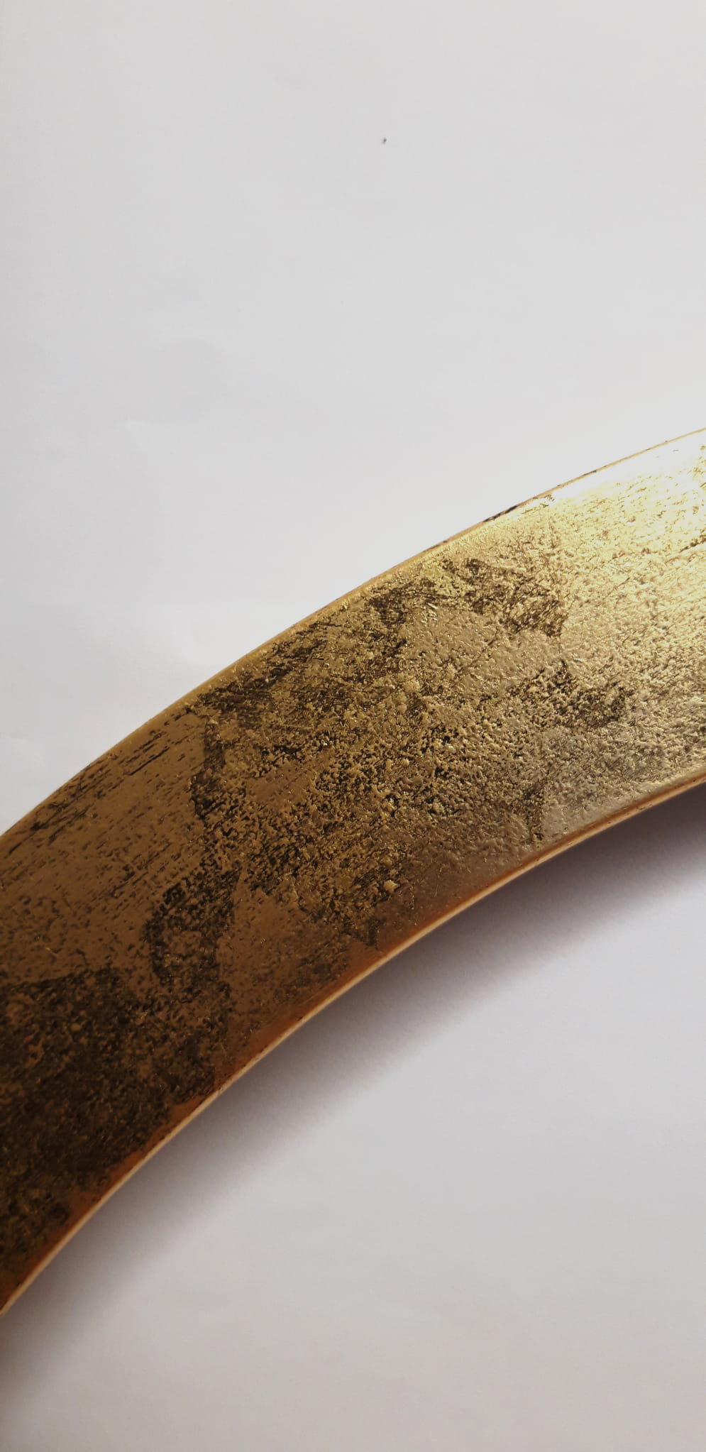 Rama lustra o bardzo nowoczesnym wyglądzie. Zdobiona jest metalem - złotem oraz patynowana dla podkreślenia wypukłości . Zabezpieczona jest lakierem, dzięki czemu doskonale sprawdza się również w wilgotnych pomieszczeniach np. w łazienkach. Stosujemy lustra kryształowe, renomowanej firmy. Rama posiada płaski, nowoczesny profil.