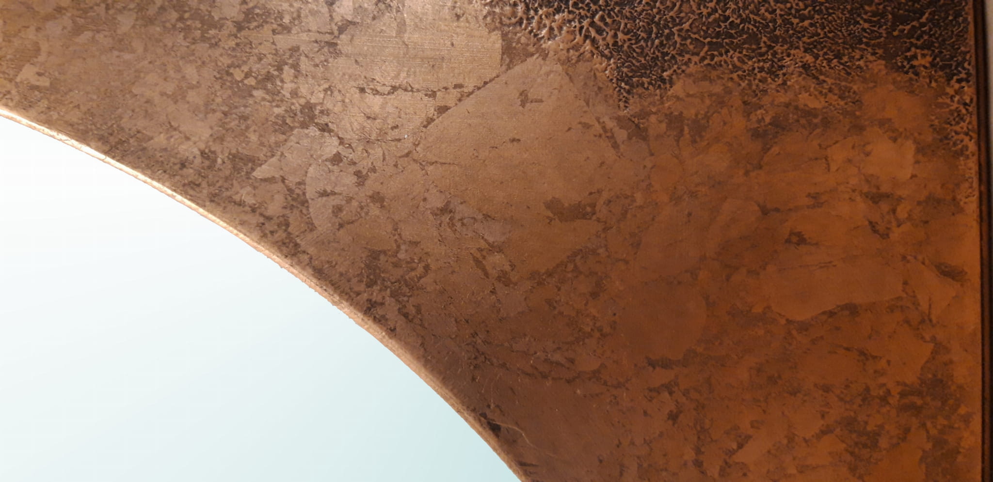 Rama lustra o bardzo nowoczesnym wyglądzie. Zdobiona jest metalem - miedzią oraz patynowana dla podkreślenia wypukłości . Zabezpieczona jest lakierem, dzięki czemu doskonale sprawdza się również w wilgotnych pomieszczeniach np. w łazienkach. Stosujemy lustra kryształowe, renomowanej firmy. Rama posiada płaski, nowoczesny profil.