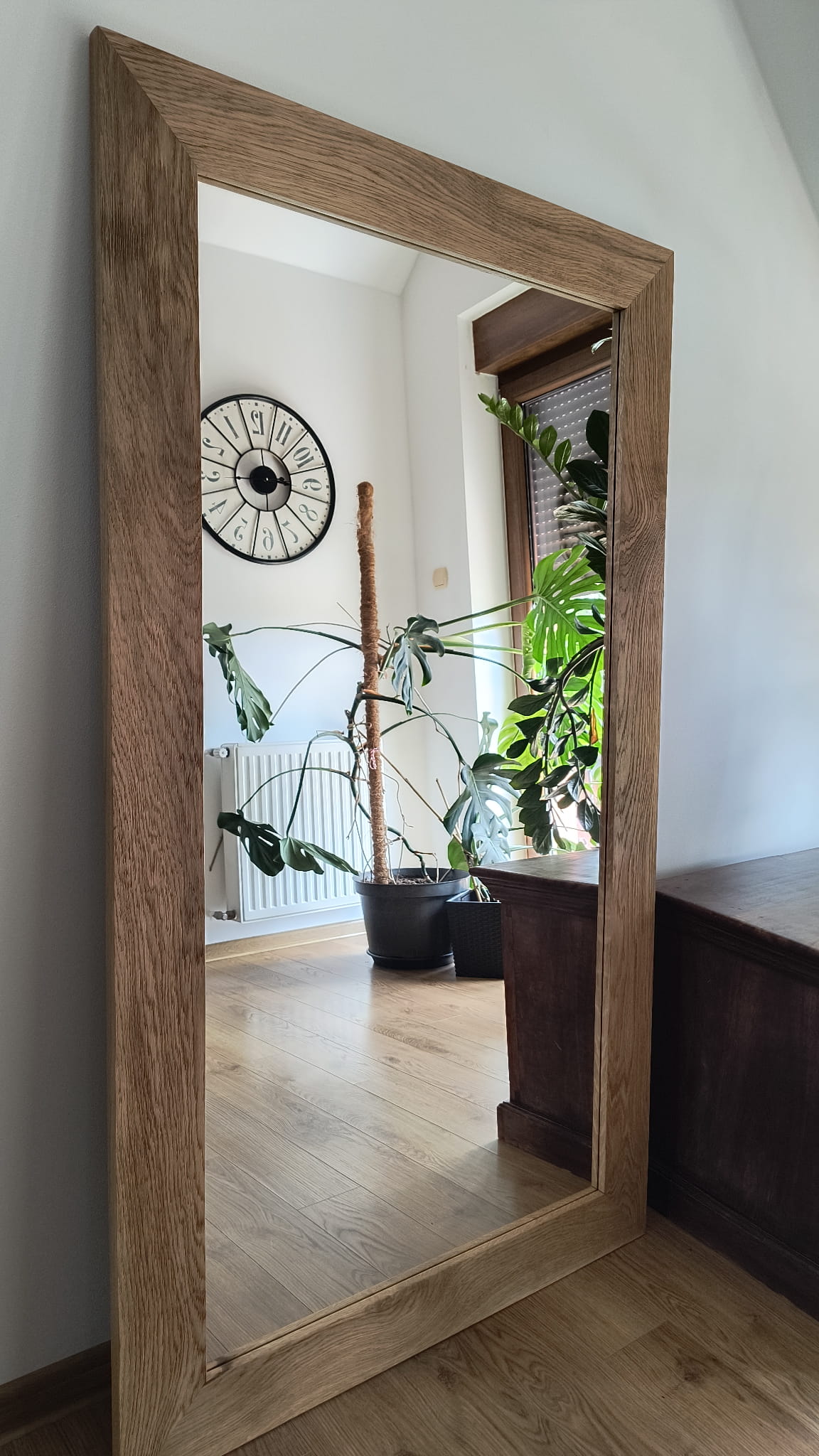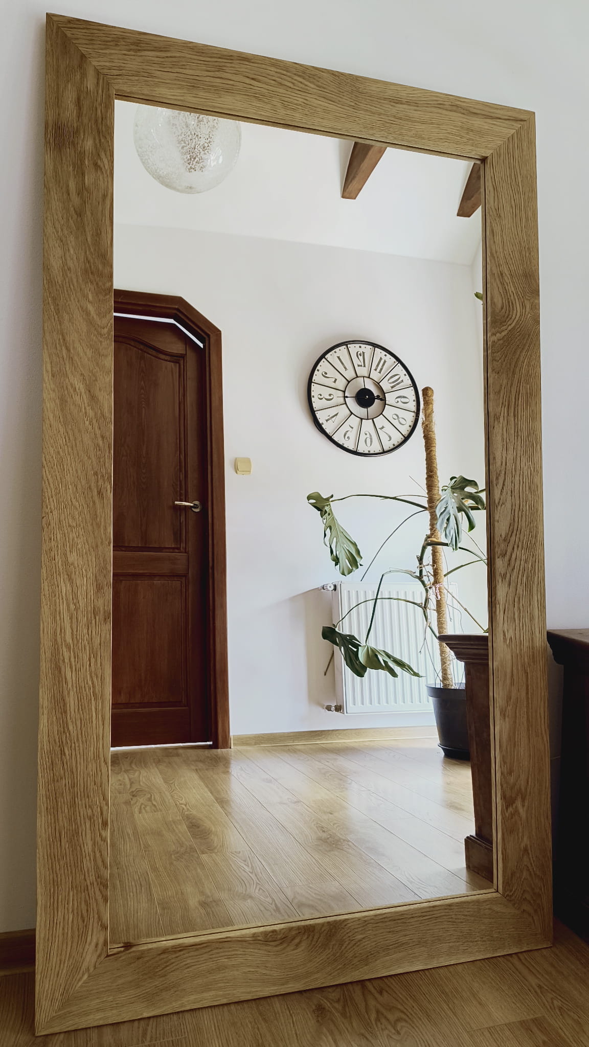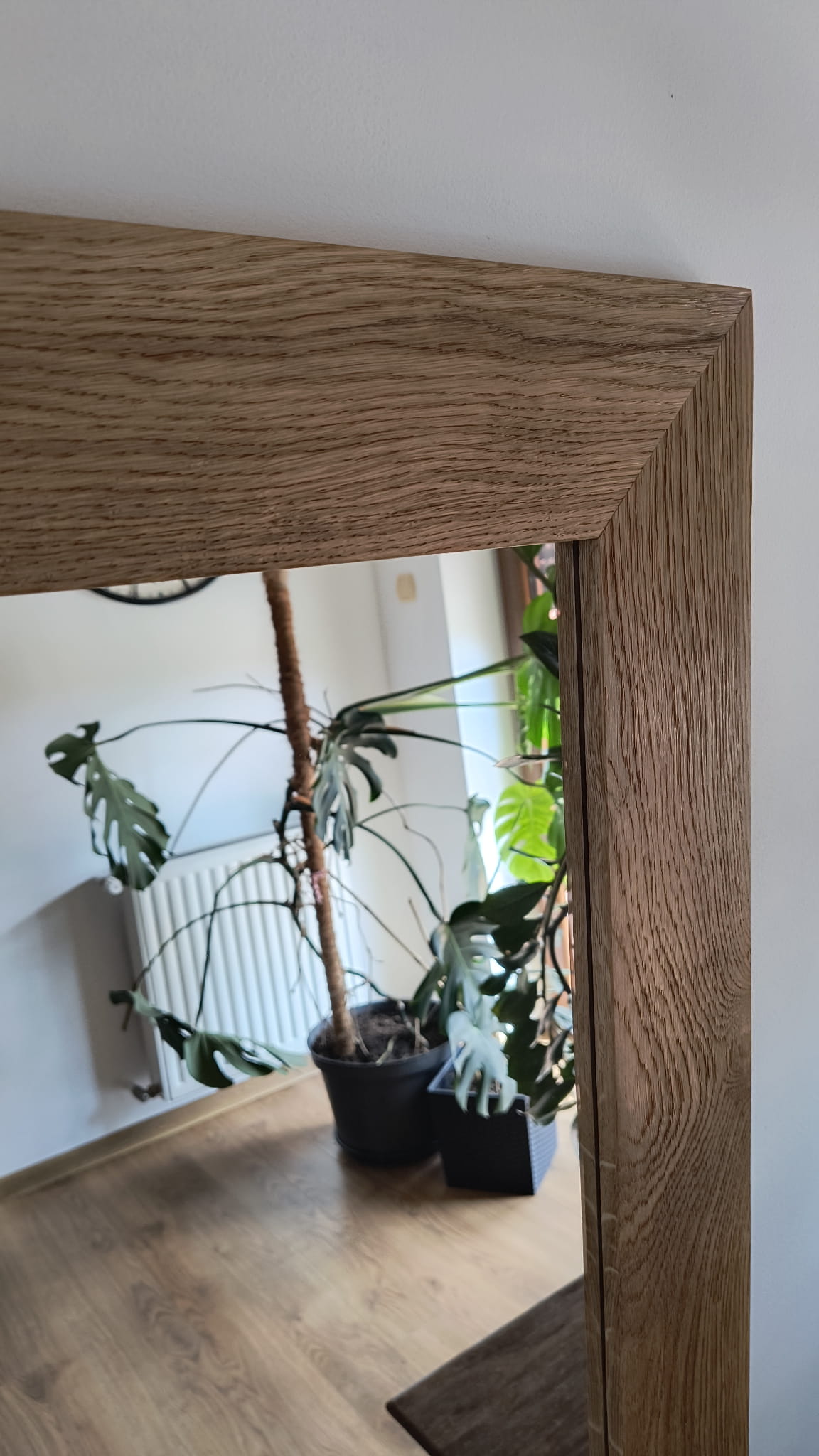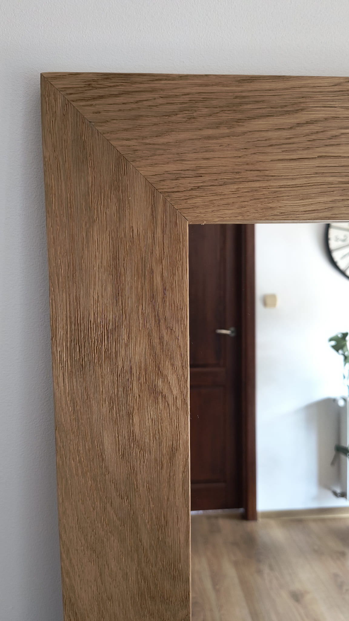 Autorski projekt pracowni plastycznej Ramoteka. Produkt w 100% powstał w Polsce. Rama lustra wykonana jest z litego dębu, posiada płaski profil. Kanty są lekko zaokrąglone. Charakteryzuje ją niezwykle piękna faktura naturalnych słojów, to dzięki zabiegowi szczotkowania oraz satynowania. Lustro można powiesić w wilgotnych pomieszczeniach - łazienkach, rama jest zabezpieczona olejem. Rama jest wykonana bardzo solidnie.Lustro w takiej ramie doskonale prezentuje się w nowoczesnych wnętrzach , na przykład z zastosowaniem betonu lub kamienia.