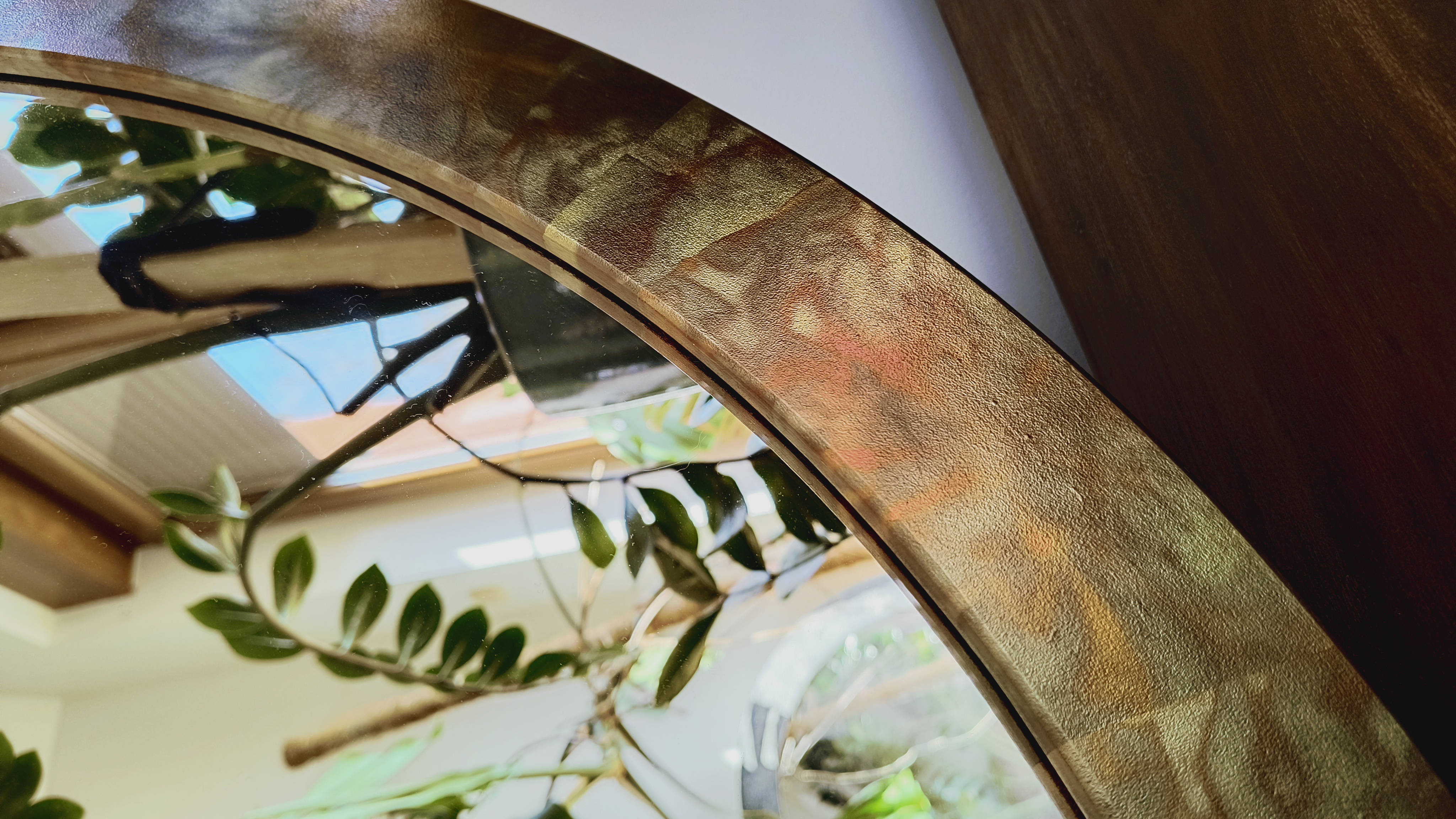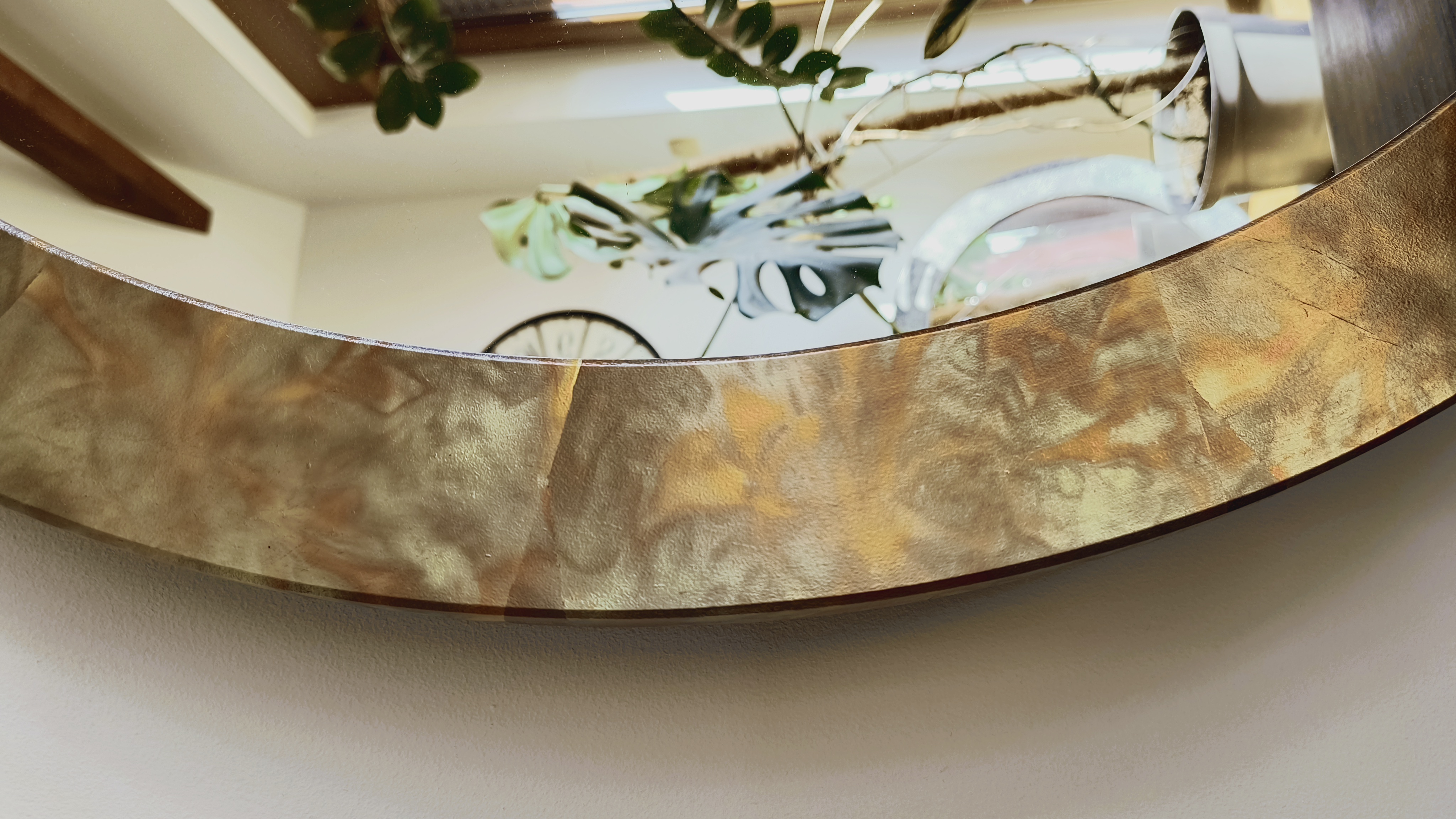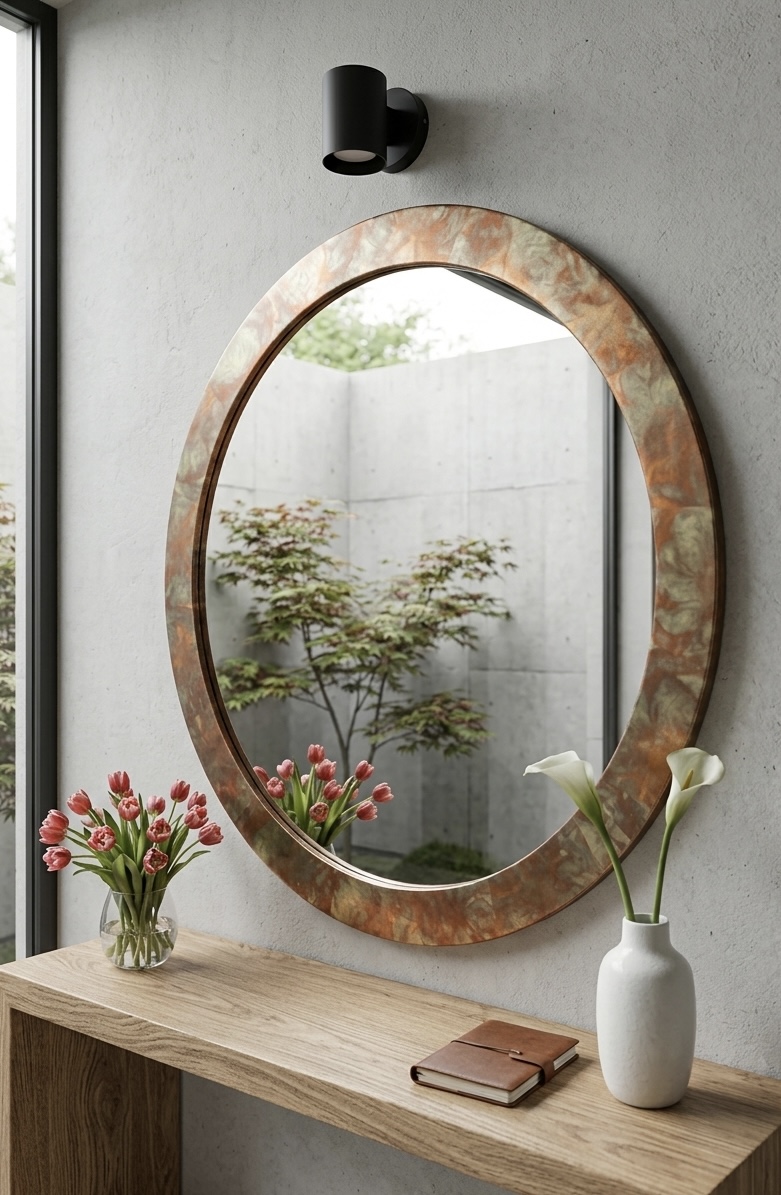 Wykończenie ramy z metalu oksydowanego, który wnosi głęboki i wyrazisty kontrast. Oksydowanie charakteryzuje się nieregularnymi wzorami i bogatą paletą barw. Rama lustra zabezpieczona jest lakierem, dzięki czemu doskonale sprawdza się również w wilgotnych pomieszczeniach np. w łazienkach. Stosujemy lustra o naturalnym, neutralnym odbiciu, renomowanej firmy. Rama posiada płaski, nowoczesny profil.