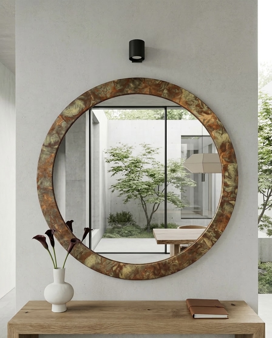 Lustro w ramie okrągłej. Metal oksydowany. Pracownia plastyczna Ramoteka