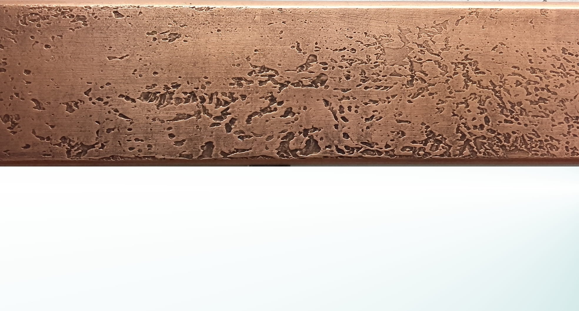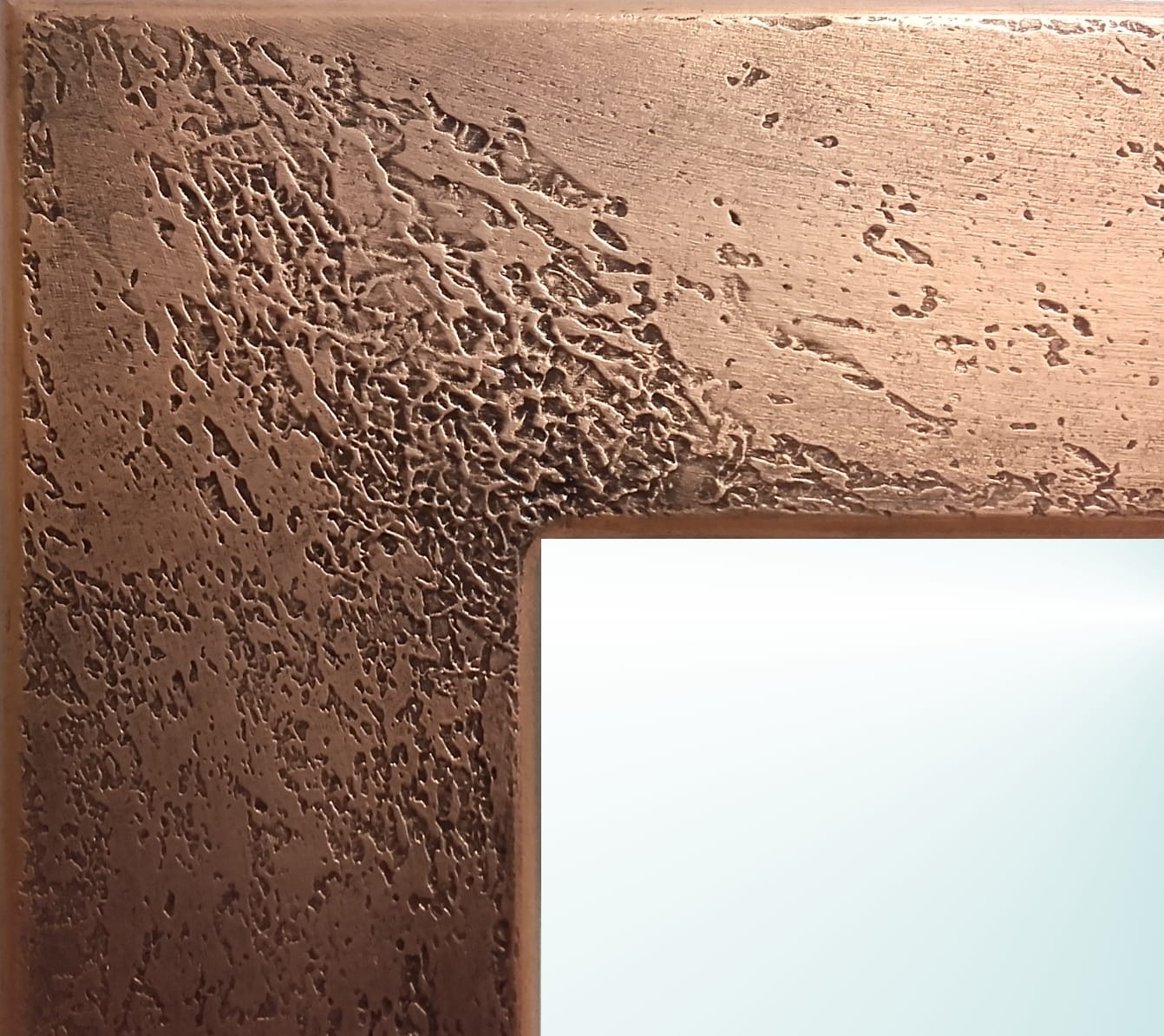 Autorski projekt pracowni plastycznej Ramoteka. Produkt w 100% powstał w Polsce.Rama lustra o nowoczesnym wyglądzie, zdobiona jest fakturą przypominającą beton.Ponadto pokryta jest metalem w płatkach (kolor miedziany) oraz patynowana dla podkreślenia wypukłości . Zabezpieczona jest lakierem, dzięki czemu doskonale sprawdza się również w wilgotnych pomieszczeniach np. w łazienkach. Stosujemy lustra o naturalnym odbiciu, renomowanej firmy. Rama posiada płaski, nowoczesny profil.